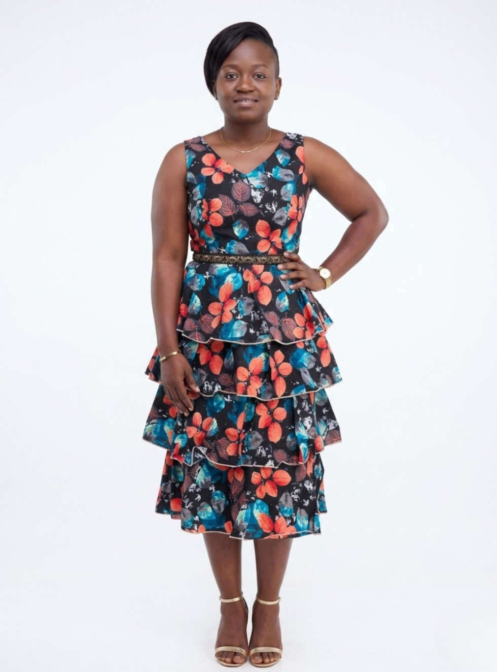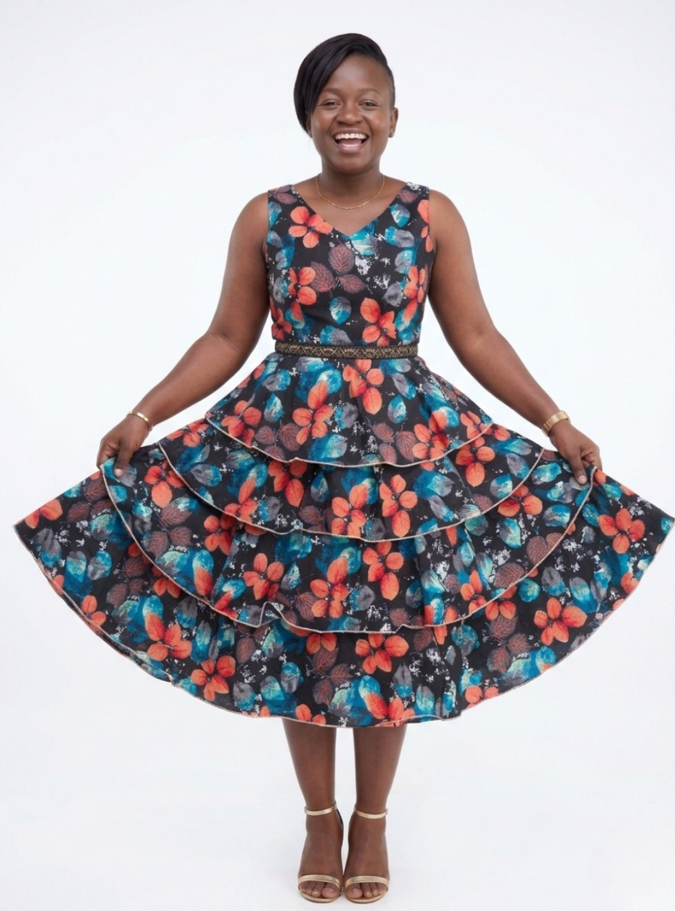 Make a bold and elegant statement with the Vibrant Botanical Tiered Ruffle Dress from Afri Dazzles. This stunning piece is designed to celebrate femininity with a beautifully tailored V-neck, sleeveless bodice that flows into a spectacular multi-tiered skirt. The crisp, structured fabric holds the volume of the ruffles perfectly, allowing the dress to sway gracefully with every step. Featuring an eye-catching array of coral blooms and teal foliage against a dark, versatile background, this dress is completed with a contrasting textured waistband that cinches the silhouette. Perfect for special events or upscale daytime gatherings, it perfectly balances modern flair with rich, culturally inspired aesthetics.